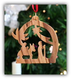 Ornamente pentru Craciun, sculptate manual in lemn sacru de maslin, cu scene religioase precum nasterea lui Iisus din Bethlehem.